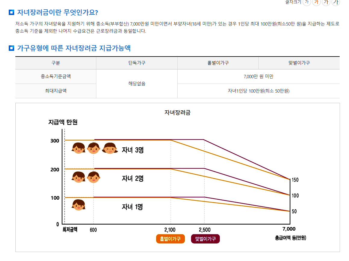 자녀장려금은 자녀수, 가구유형, 연간 총소득 에 따라 차등 지급됩니다: